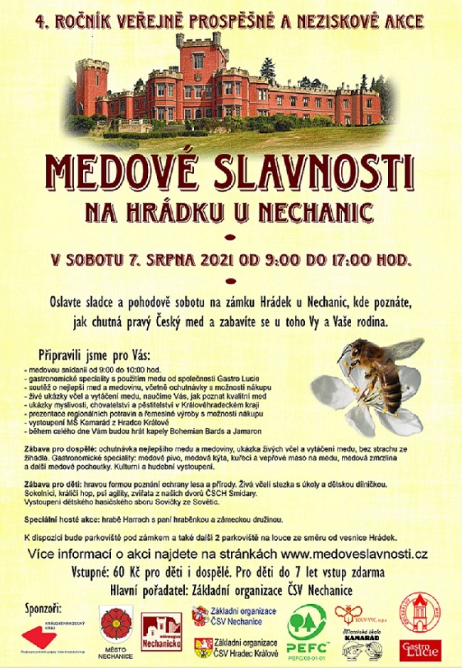 Náš královéhradecký spolek se zúčastnil Medových slavností na Hrádku u Nechanic v sobotu 7. srpna 2021. Tuto slavnost uspořádali nechaničtí včelaři, počasí nám přálo, byl nádherný den. Přišla spousta lidí, kteří se zajímali o včely, včelaření, ochutnávali med, popíjeli medovinu, kupovali si regionální potraviny, vynikající maso, klobásky, pivo, ledovou kávu, zmrzlinu a jiné dobroty. Kupovali si med, klobouky, dřevěné hračky, keramiku …. Poslouchali přednášky, dívali se na živé včelky a s dětmi hledali matku královnu. A hlavně panovala dobrá nálada, všude bylo spoustu laviček, na kterých seděli návštěvníci a užívali si pohodu.